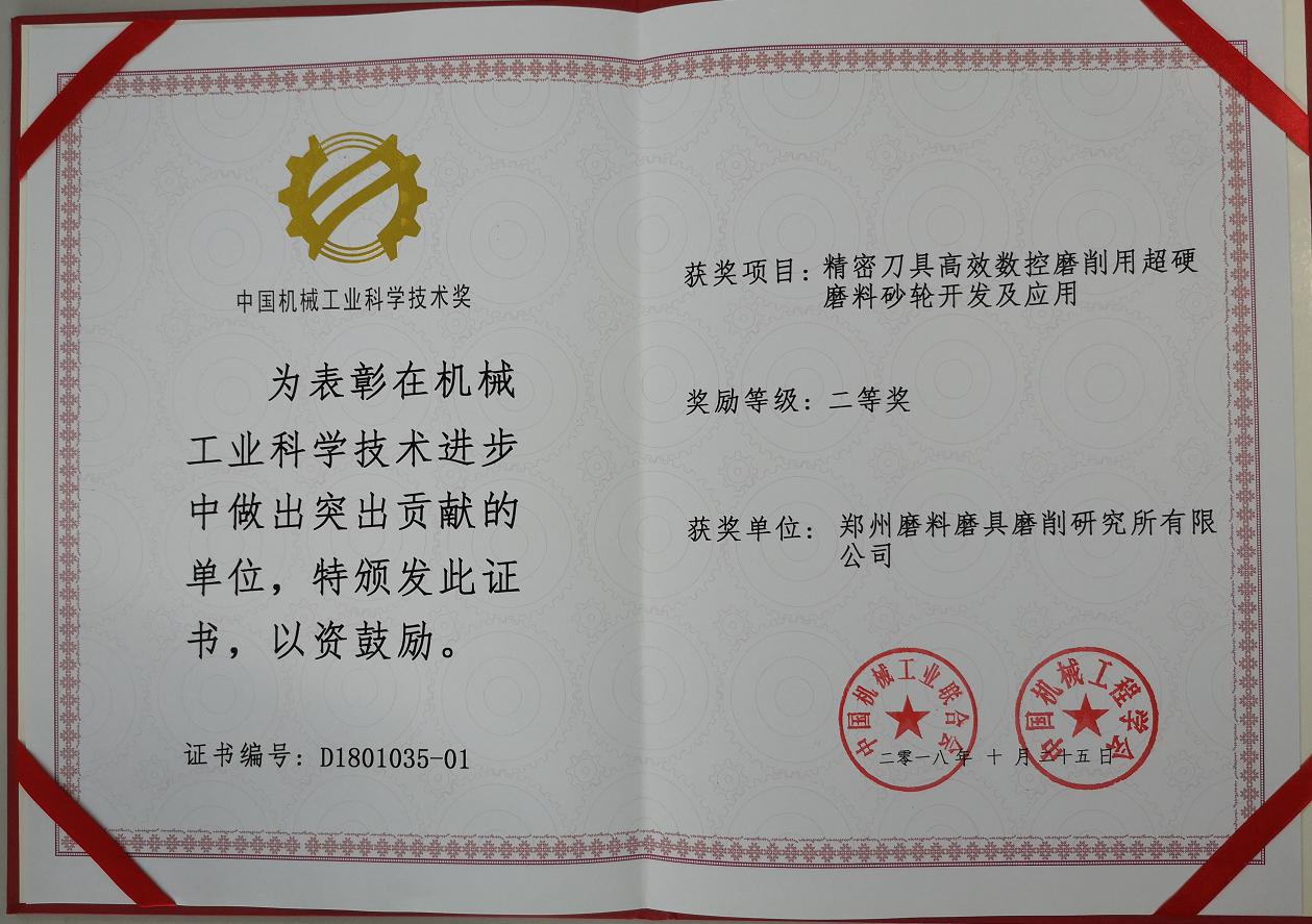 该项目通过高效耐磨复合结合剂制备、高表面加工质量砂轮配方设计、砂轮用功能型基体制备、砂轮高精度加工制造等多项关键技术突破,开发出了精密刀具数控高效磨削用超硬砂轮,经中国机械工业联合会组织鉴定,总体技术达到国际先进水平,同时通过国家科技重大专项实施管理办公室组织的专家验收,验收考核指标是研制出的砂轮产品耐用度等性能指标均达到了国际先进水平。