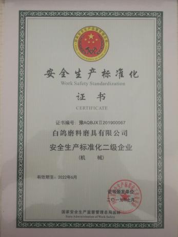 为进一步落实企业安全主体责任,促进白鸽公司安全生产工作标准化管理,精益生产推进部(安全办)在白鸽公司安委会的指导下,通过自主创建、自评、申请、专家评审及现场审核,于2019年7月获得了“安全生产标准化(二级)企业”称号,并由河南省安全生产标准化工作委员会颁发了“安全生产标准化(二级)企业”证书。