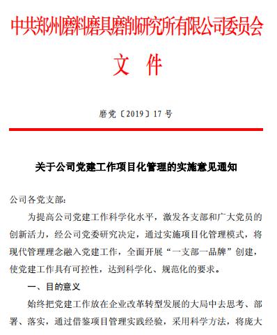 郑州三磨所在深入调研、充分论证,广泛听取支部和党员意见建议的基础上,将项目化管理的理念和方法植入支部党建工作,推出了“一支部一特色”党建品牌创建工作,改善以往支部在教育、管理、监督和服务方面形式单一、针对性不强、工作结合不够紧密等问题,有效推动各支部 “三会一课”、 主题党日等组织生活制度与业务工作的有机融合,创新了学习方式,找准了党建与业务工作的契合点,为基层党建工作注入了新的活力。