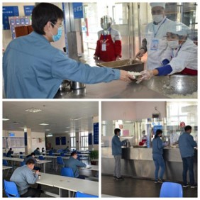 加强食堂的卫生监管和规范操作,除每日对食堂进行全方位的消毒处理,要求供餐公司进一步加强物资采购和人员管理。为避免集中用餐,采用按部门错峰用餐制度,复工第一天,返岗员工均佩戴口罩并自带餐具,做到了有序分批取餐。