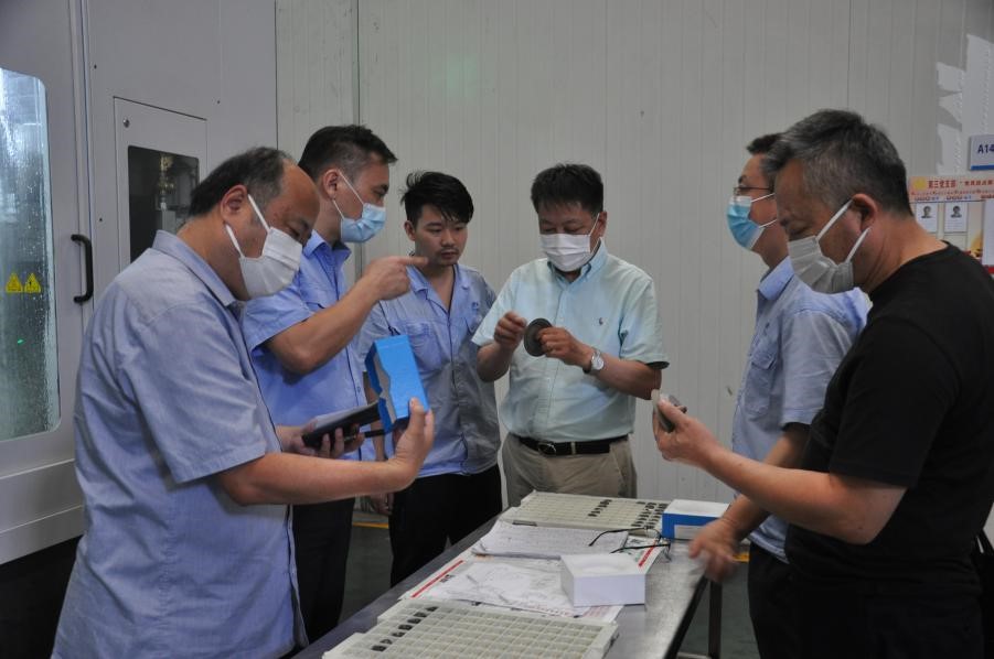 调研组一行深入车间一线了解产品研发、质量管控、生产效率等问题,指出技术研究需要科学方法,用科学规律指导科研生产实践,提高工作质量,不可盲目试错。