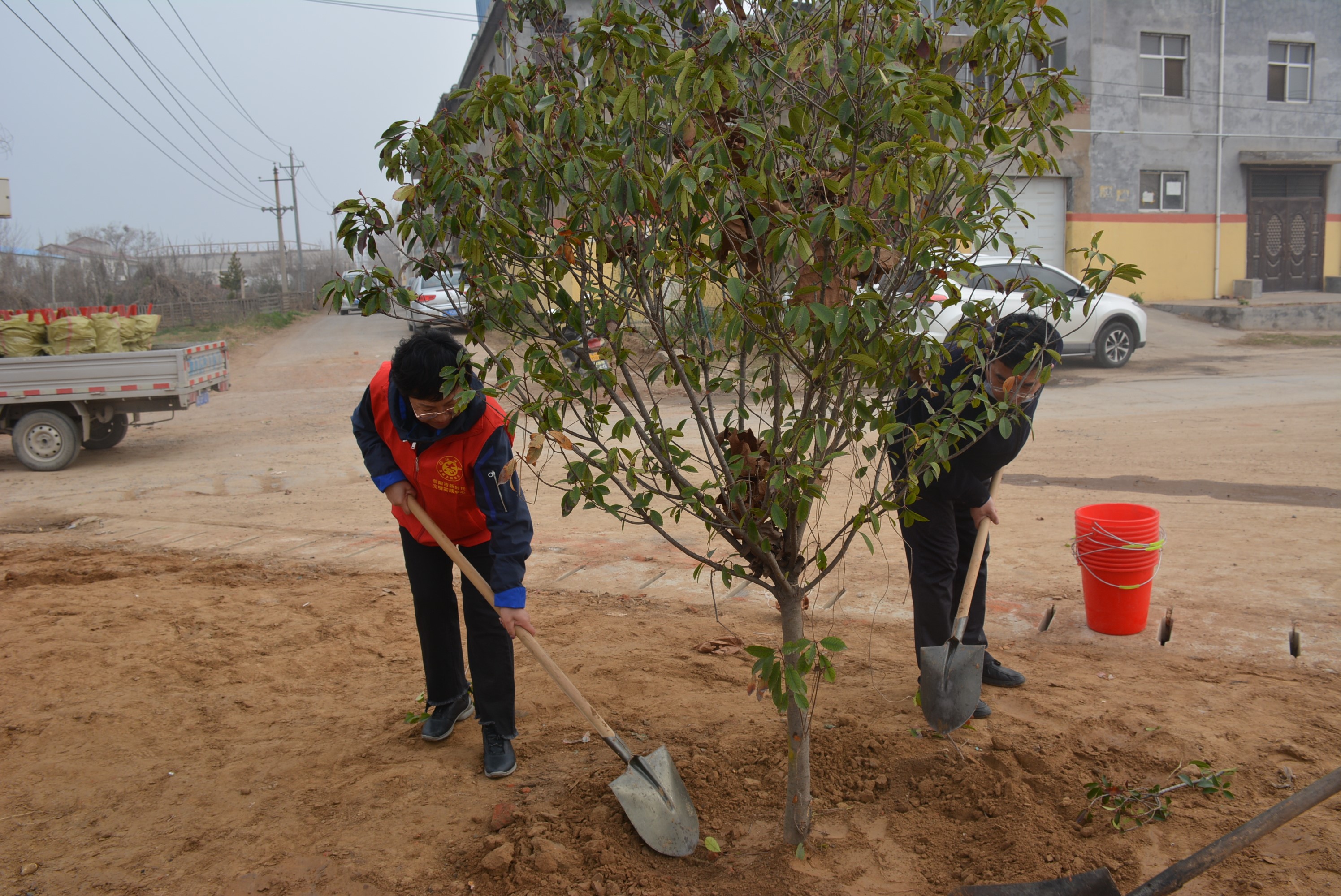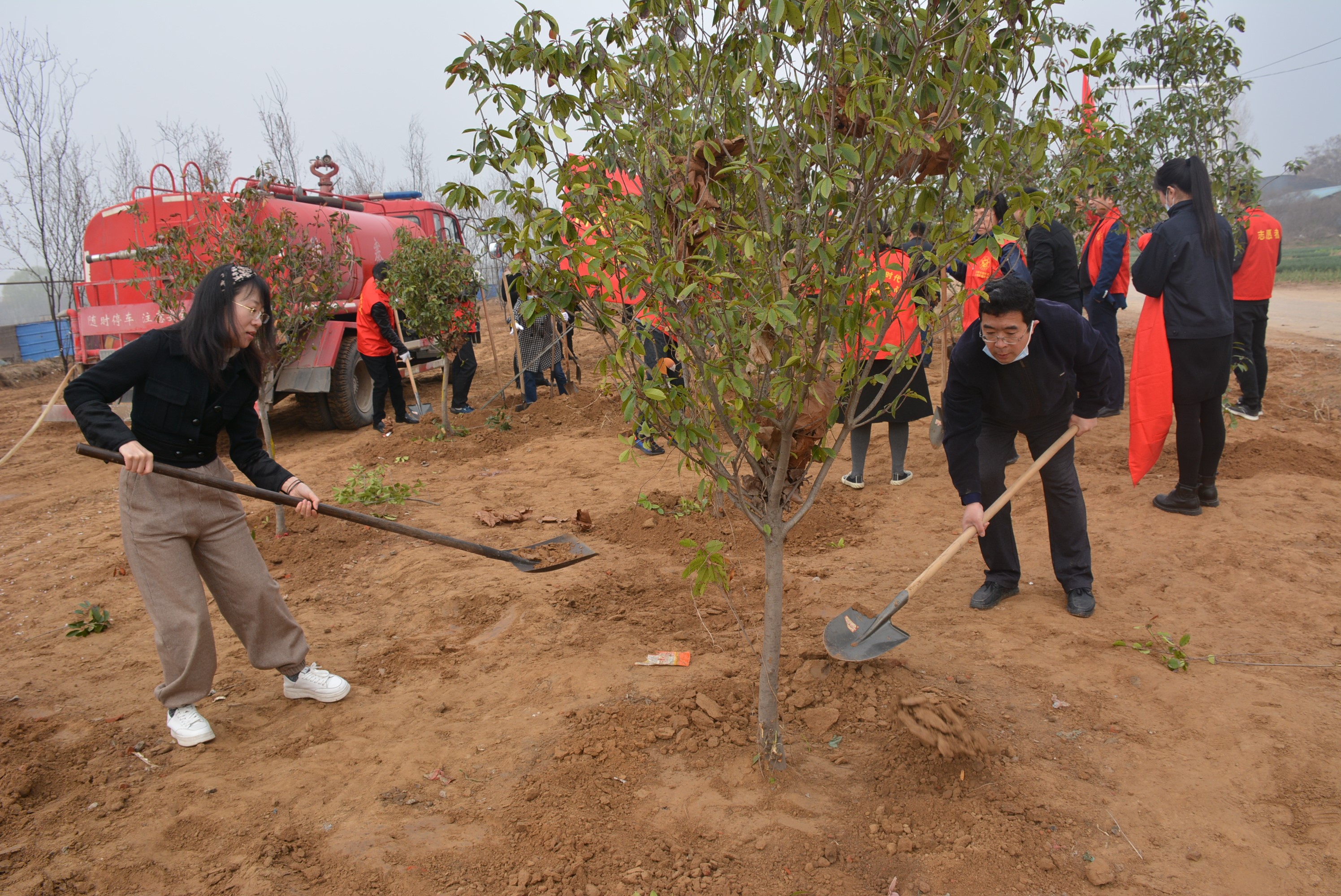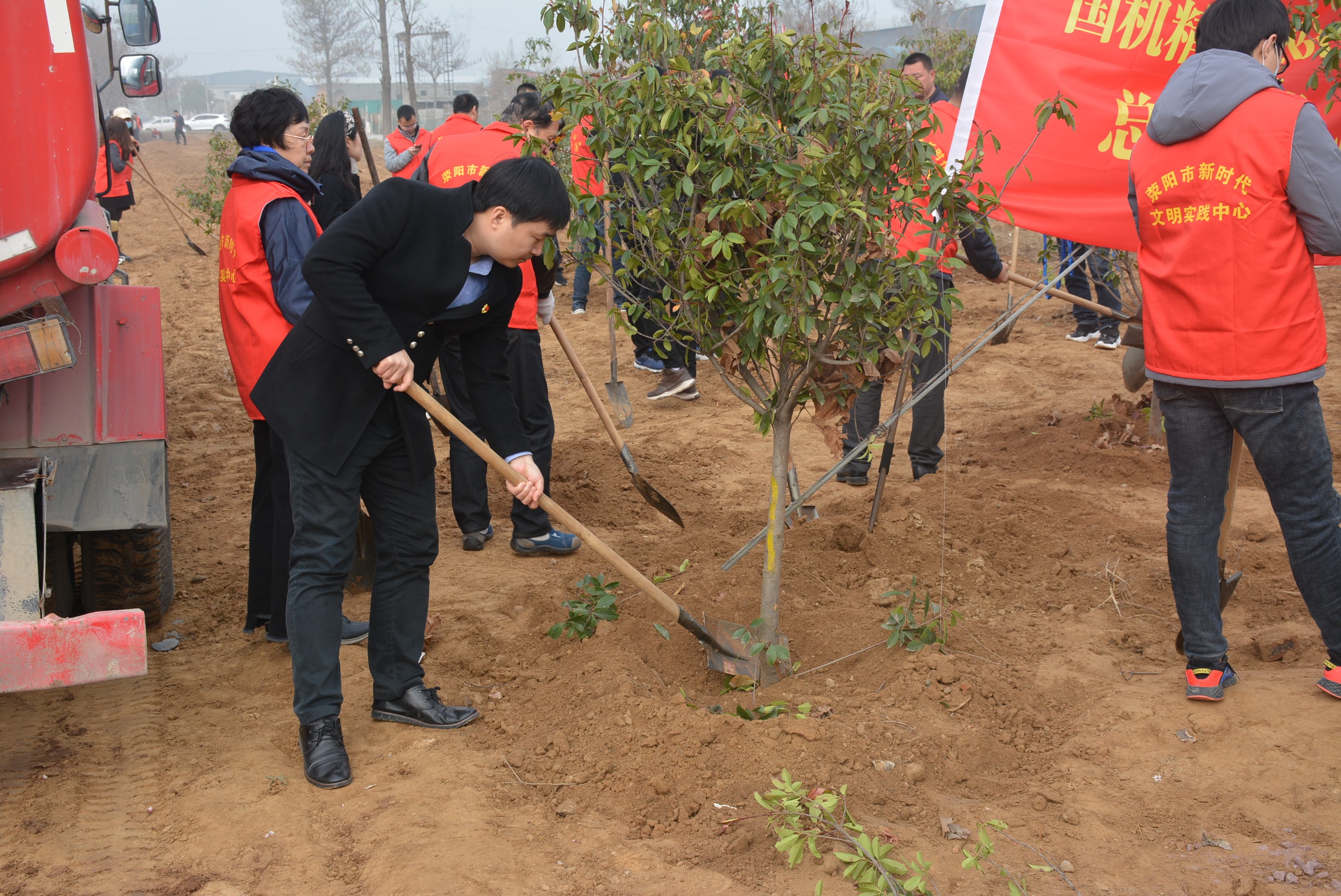 上午九点,大家前往金寨乡植树地点,分组分片后随即开始义务植树。广大党员职工卸车装车、搬运树苗、扶正树苗、填土浇水……大家干劲十足、配合默契,现场热火朝天、气氛热烈。经过一个多小时的辛勤劳动,精心栽培,为道路两旁增添了几十株红叶李和石楠,为金寨乡增添了一抹新绿。