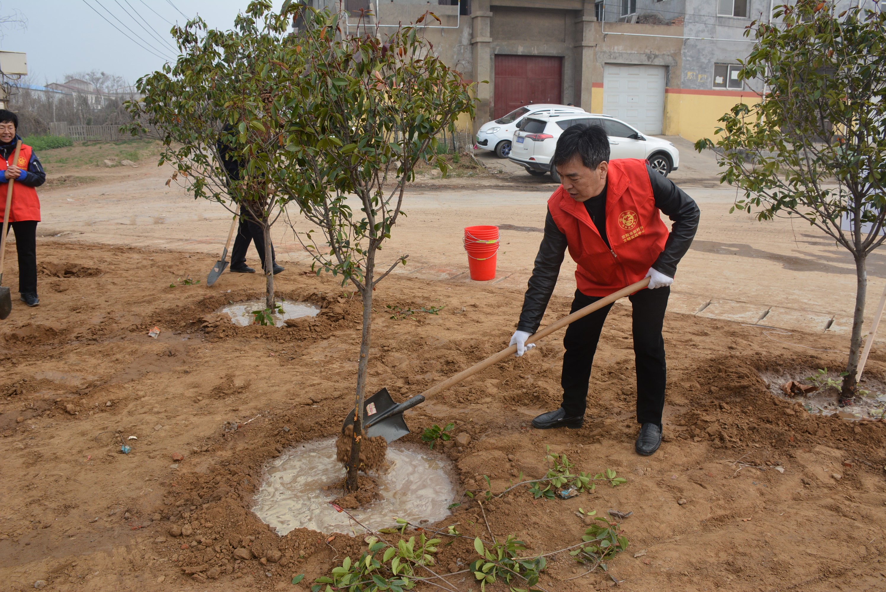 上午九点,大家前往金寨乡植树地点,分组分片后随即开始义务植树。广大党员职工卸车装车、搬运树苗、扶正树苗、填土浇水……大家干劲十足、配合默契,现场热火朝天、气氛热烈。经过一个多小时的辛勤劳动,精心栽培,为道路两旁增添了几十株红叶李和石楠,为金寨乡增添了一抹新绿。